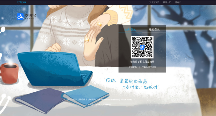 登录首页中间位置的“支付宝账号”点击后跳转到支付宝二维码扫描页面,使用支付宝扫描二维码即可实现登录。