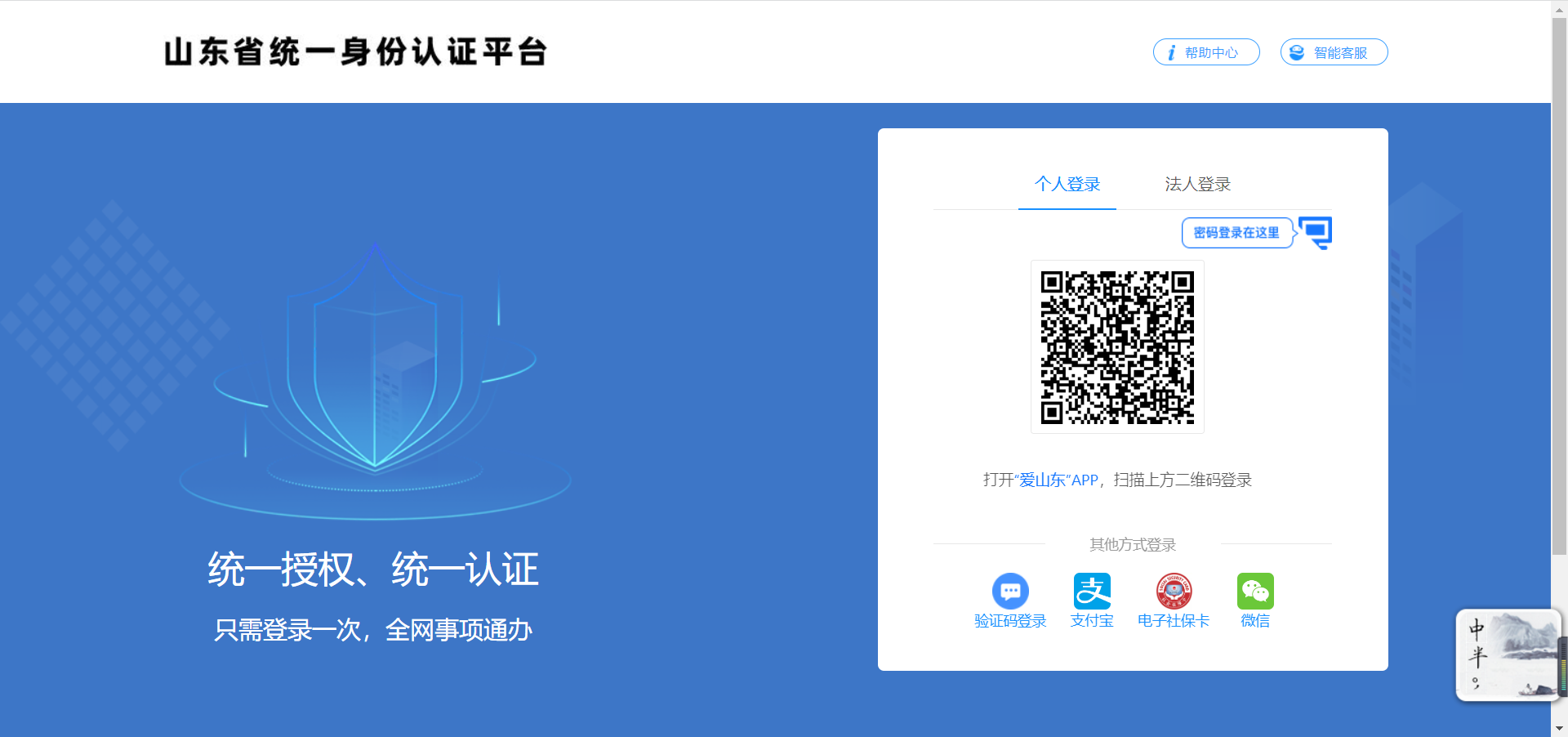 鼠标点击下图的“扫码登录”按钮弹出二维码,打开手机APP“爱山东” 点击APP首页的“扫一扫”功能,扫描网页上显示的二维码进行登录。