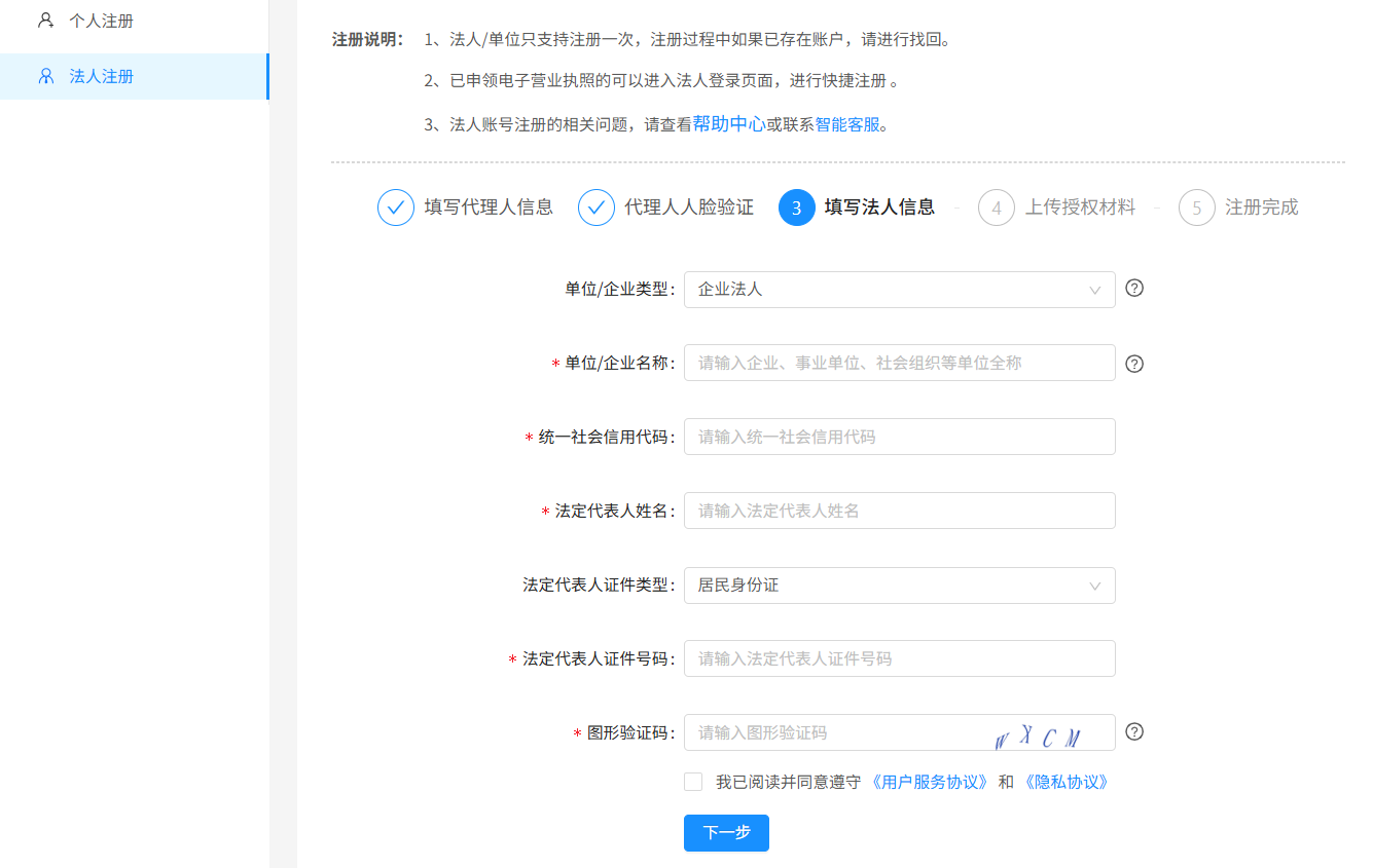 按照要求,填写法定代表人的单位名称、统一社会信用代码、法定代表人姓名和证件号。所有信息确认无误后,进入到下一步。