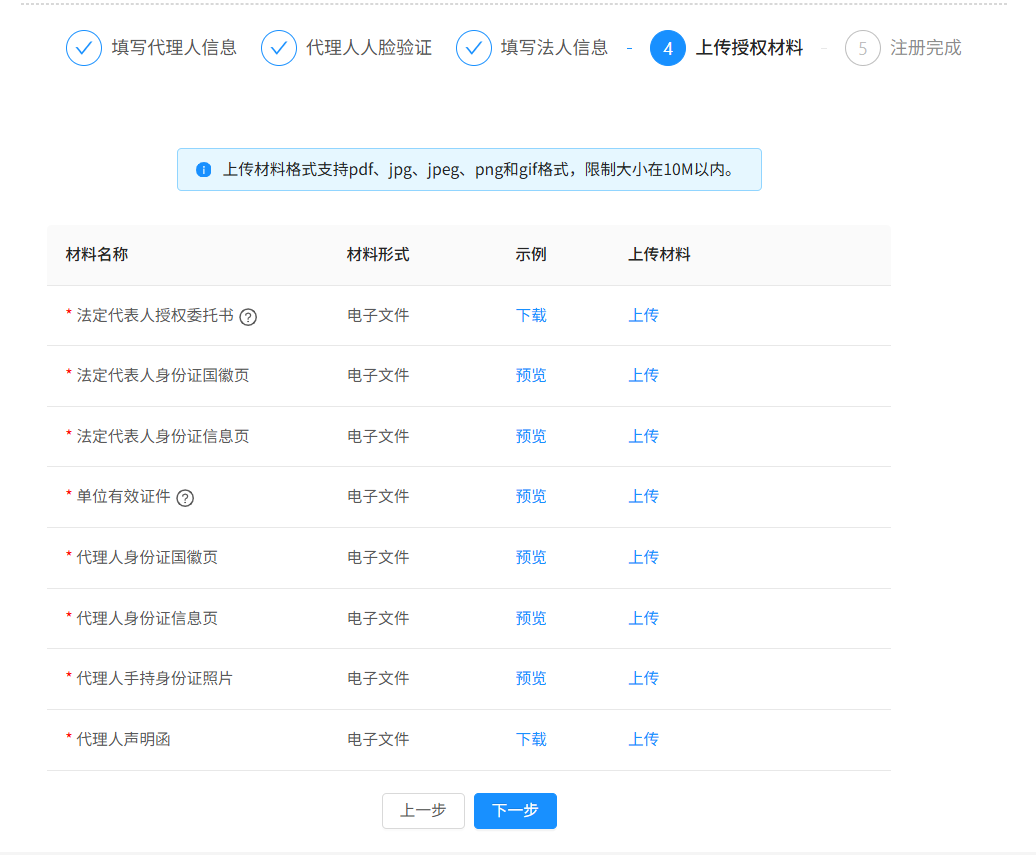 账号信息通过后,进入到上传资料页面,需要上传法人授权委托书、法定代表人身份证国徽页、法定代表人身份证信息页、营业执照副本、代理人身份证国徽页、代理人身份信息页、代理人手持身份证照片以及代理人声明函。
