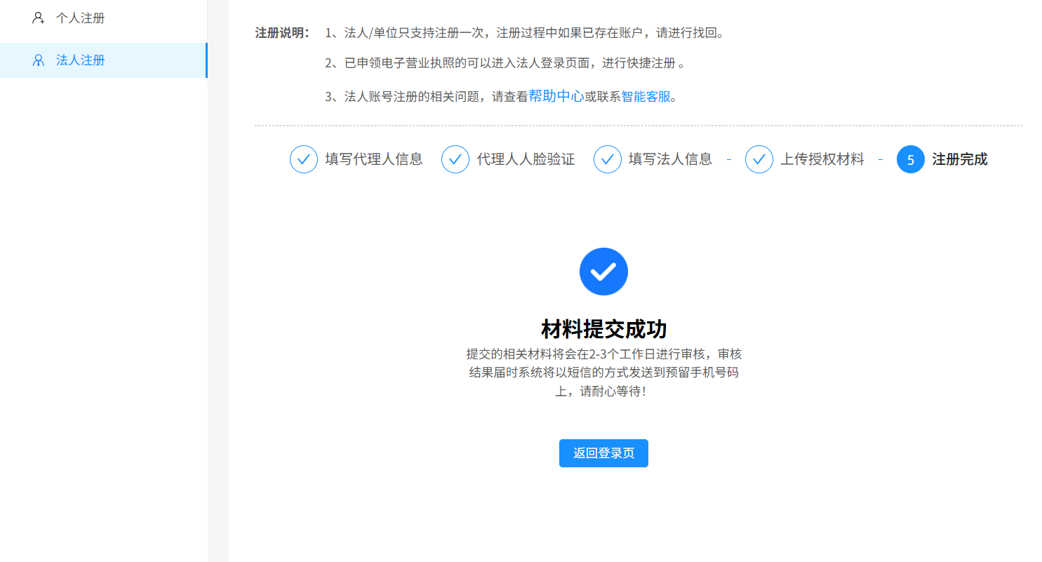 出现以下界面,说明法人账号已注册成功。