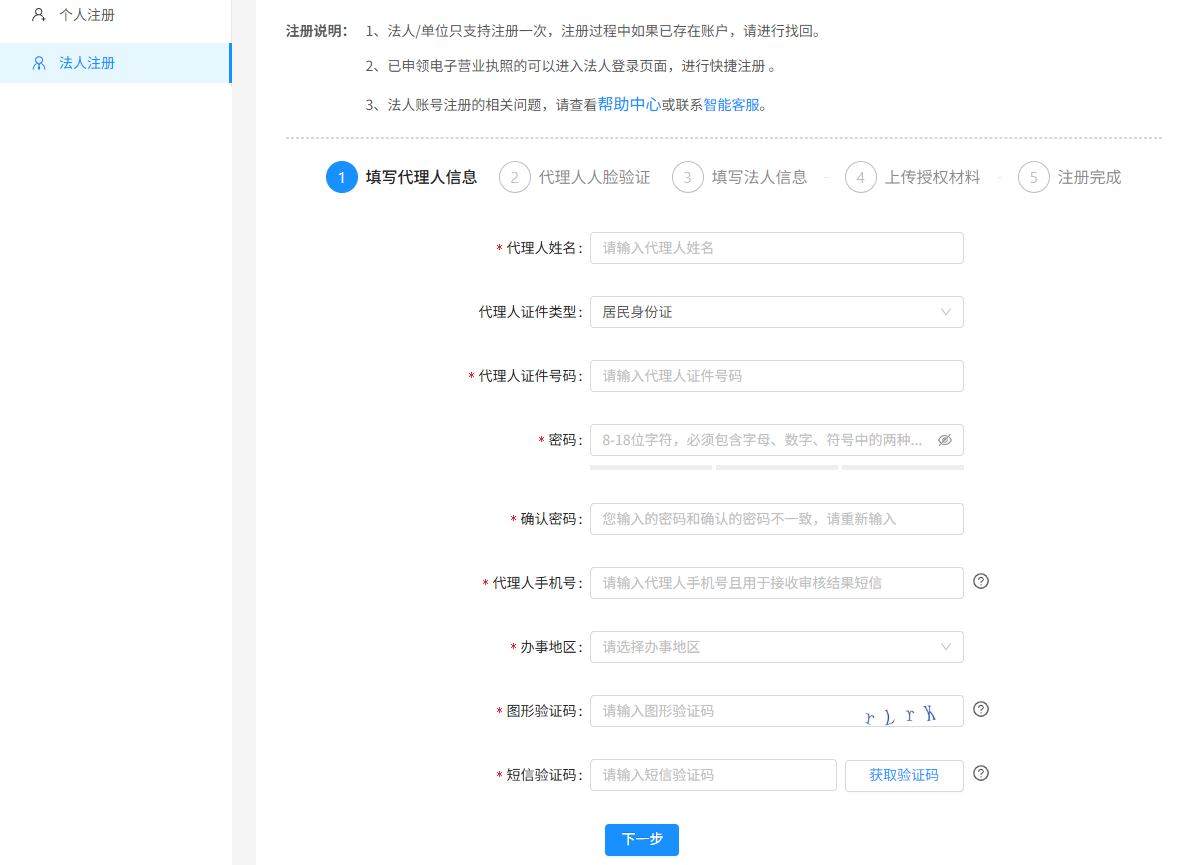 代理人注册:该场景适用于法定代表人本人不能亲自办理,从而全权授权委托代理人角色进行办理。